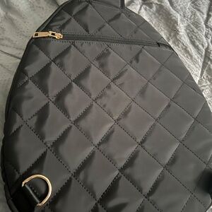 Brand new black pickleball racket bag by Lemonbella. Can be crossbody. Material is down. One main pocket, one interior patch pocket, one racket pocket, one front pocket and one back pocket. Adjustable strap. Zipper closure.