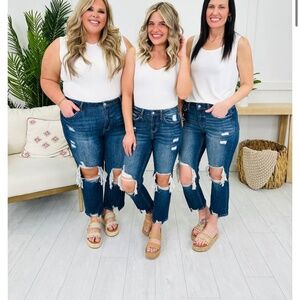 I just ordered these (final sale) and they fit great but the distressing just hits me in a weird spot. Straight leg cropped. Size 20 (fits more like a 22)
