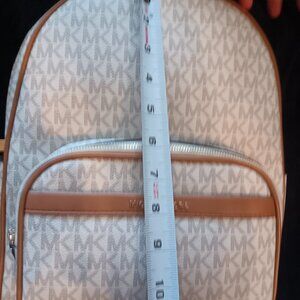 Super cute backpack with adjustable straps! Lots of pockets- 2 side pockets, 2 front pocket with zipper and interior pocket with zipper! Great backpack for travel and on the go. Vanilla/acorn color.