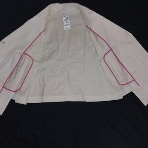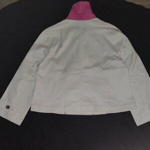 Effortlessly chic and versatile, this ON.34th women's cropped jacket is a standout piece for any wardrobe. Crafted from a lightweight cotton blend, it features a crisp white hue and a double-breasted front with four bold buttons for a tailored touch. The wide lapel collar adds a modern edge, while the long side straps with buttonholes offer styling flexibility—wear them tied, tucked, or left loose for a relaxed vibe. Tagged as size Large and brand new with tags (NWT), this piece is perfect for layering over dresses or pairing with high-waisted jeans for a polished casual look.