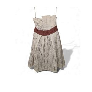 Beautiful Ryu eyelet lace strapless dress in cream with a soft brown ruched waistband. New with tags. Features a pleated bodice, full A-line skirt, and feminine eyelet detail throughout. Perfect for spring events, bridal showers, vacations, or casual summer parties.