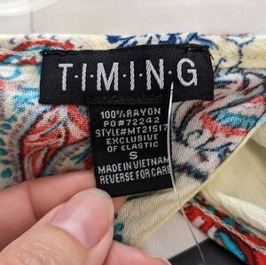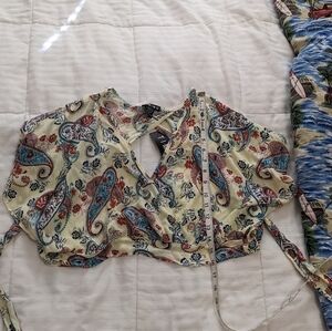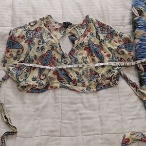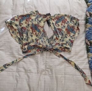 new with tags NWT blousy high crop top size small. the front has almost a wrap style cut and it ties in the back. the shirt has a linen style feel and it's nice and lightweight. the top is pretty blousy. the pattern is so pretty with a light creamy yellow base and orange and teal paisley pattern and flowers over the top. this is a great top for the warmer months
