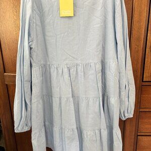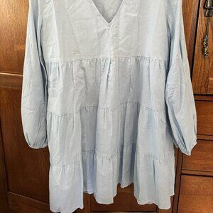 Baby blue Agatha mini dress, sky blue with tags. V-neck, long sleeves with elastic wrist.