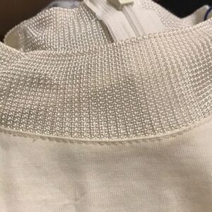 Concealed zipper in the back. Never worn. Still has tags attached. Slightly stretchy. Material is 100% cotton stretchy knit detail on the neck.