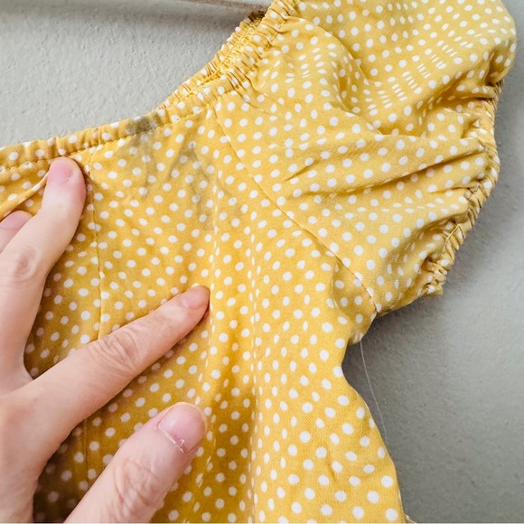 Alll new with tags: two item bundle, Volcom smocked off the shoulder crop top and Row A button down polka dot printed crop top both size small. Large brown functional button accent.