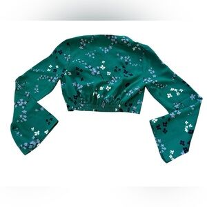 Keywords: MINKPINK floral crop top, festival blouse, tie-front green blouse, trendy Y2K crop top, boho chic long sleeve