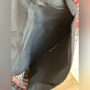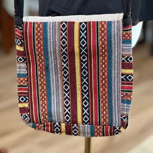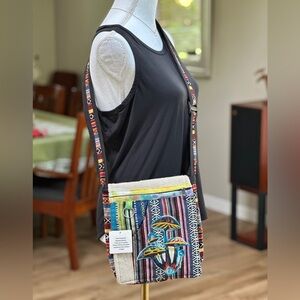 New with tags. Natural cotton bag with outside slip pockets and key attachment. Zip pocket on back. Zip pocket in flap colorful pattern with mushrooms embroidered on top. Adjustable shoulder strap. Please confirm measurements approximate laying flat as Poshmark does not accept returns for size issues. Please scroll to see all eight photos provided.