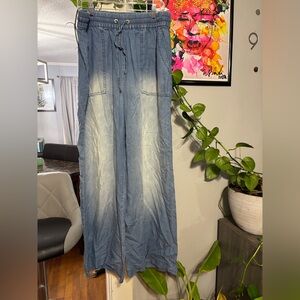 Jean look, very soft, wide legs. Dress em up or down. Faded Jean look. Elastic waistband and drawstring. Front and back pockets.
