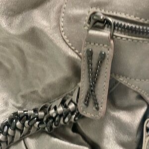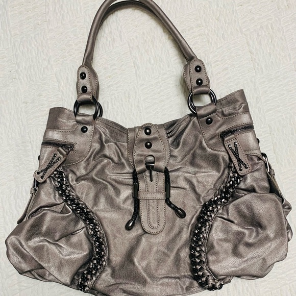 New without tags, Nicole Lee, USA, metallic, silver shoulder bag. Black metallic hardware all over the bag. Black metallic accents on zipper poles very shimmery bag absolutely gorgeous! 22inch shoulder straps.