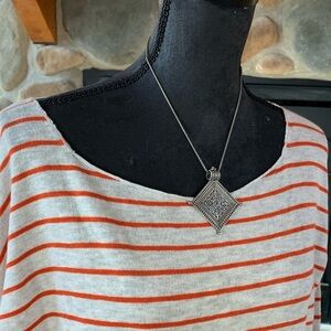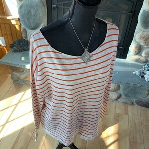 100% cotton lightweight long sleeve boatneck shirt made in China for Vince. Oatmeal and orange stripes. Size large. Measures ~25” P2P. New without tags.