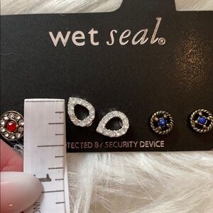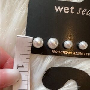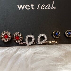 Six pairs of new without tags pierced earrings three pairs are statement pearl earrings one pair is faux gold with faux diamonds and some kind of red stone