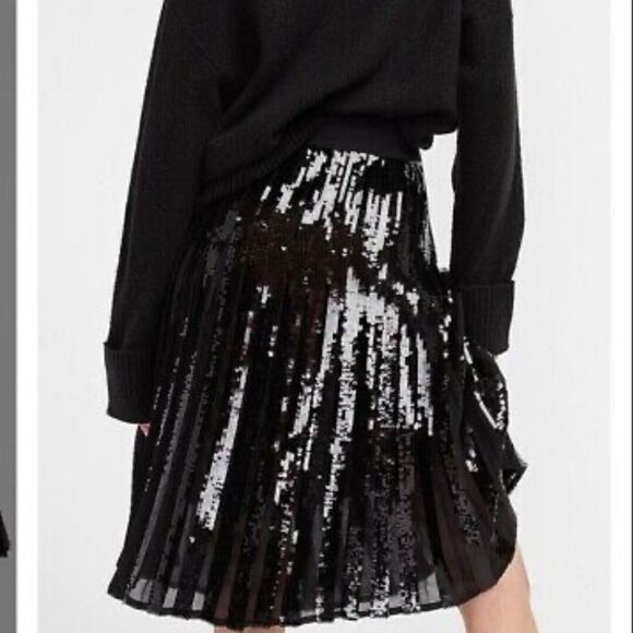 New with tags Express Black Sequined/Pleated High Waisted Midi Skirt Size XS. Pleated with sequins all over, hidden zipper closure on the side. Fully lined. Falls below the knee. Black satin waistband. Approximate measurements are waist 14”, length from waistband 26”. MSRP $98