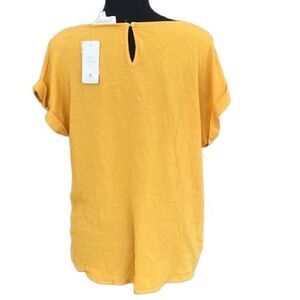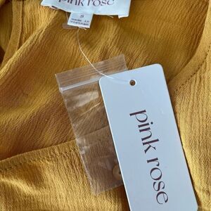 New with tags Pink Rose gold rayon knot front top with cap sleeve, size S. Keyhole back with button. Longer in back with rounded bottom hem. Approximate measurements are pit to pit 21”, length from shoulder approximately 21-25”.