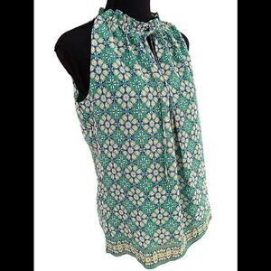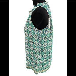 New with tags Max Studio sleeveless lined green print top, size XS. 100% polyester, keyhole front with tie. Print Chiffon overlay with lining, relaxed fit. Small soft ruffle at neckline, soft pleat down the front. Approximate measurements are pit to pit flat 18”, length from shoulder approximately 25”.