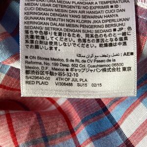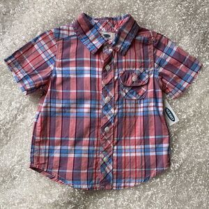 Short sleeve, collar, button up, front button pocket, Fourth of July red plaid mix of colors