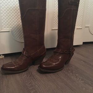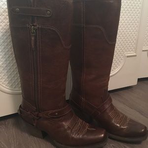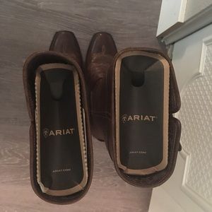 New Ariat boots. Never been worn. Original price is $250. Leather. Knee length. Square toe. Zipper and snap tab closure. Stiff leg. Have been sitting in box and needs someone who will love to wear them.