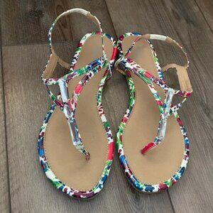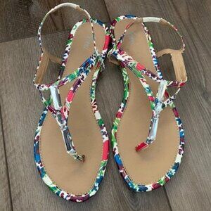 NEW (only worn 1x) from FIONI ~ Bright MULTI-COLOR on the edges of the top & sides of the sole & on the straps ~ TAN Vegan leather on inner sole (and under-side of straps). 3 BIG CZs on the strap that goes down the front of your foot. NO BUCKLES (yay!) ~ just elastic in back of your heel ~ double strap (together) goes from the side strap and then branches apart into 2 separate straps over your instep (which is where the CZs are). SUPER COMFORTABLE! The multi-color fabric is shiny and would just wash off, if it got dirty. ** Colors are BRIGHT Green ~ Turquoise & Navy BLUES ~ RED ~ Dark PURPLE ~ WHITE background. ** These are perfect if you're just wearing a plain pair of pants or jeans, and a plain top and want something to brighten up your look. Or, stick them in a suitcase and they'll go with just about anything packed for a beach / cruise / resort vacation.