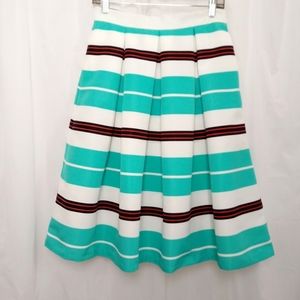 New w/tags New York & Company box pleat A-line striped midi skirt. Vibrant white and lt. turquoise striped with navy and orange accent stripes. Features 2 side lined pockets and invisible side zipper w/hook & eye closure. Approx measurements: Waist 14", Length 26.5". Size 6.