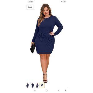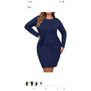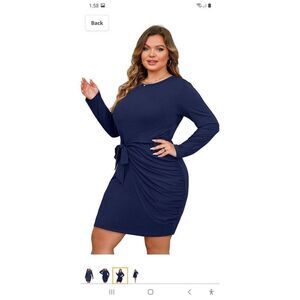 New 2X Olrik Blue Sexy Wrap Midi Dress Knot Front Ruched Long Sleeve Dre…