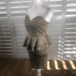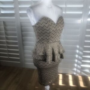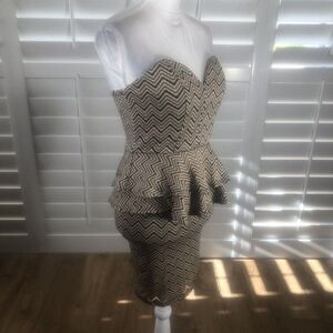 Sexy strapless stretch dress with stays/boning for extra support. Sweetheart neckline, peplum, fitted mini dress. Taupe/black wavy lines. Brand new/tags. No flaws. Medium.