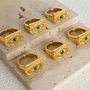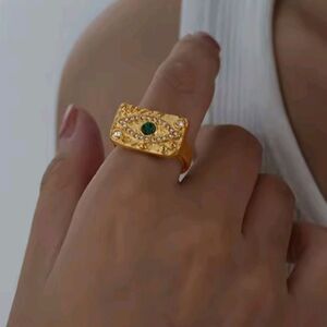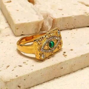 A bold fusion of ancient protection and modern luxury. This striking talisman ring features a deep green malachite centerpiece, symbolizing transformation and protection, encased within an all-seeing evil eye motif. Surrounded by shimmering rhinestones and cast in rich gold-tone titanium steel, it's more than jewelry — it's a powerful statement of style and strength.