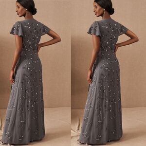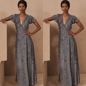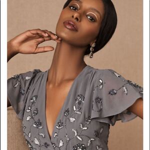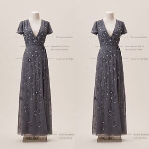 Metallic beading is a stunning complement to a dusky hue on this effortlessly glam wrap dress with flutter sleeves. See Size Guide measurements for detailed sizing information