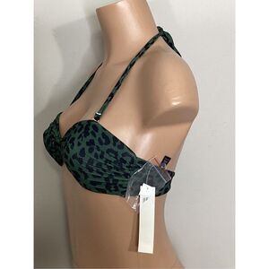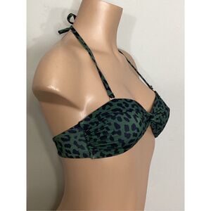 New. AQUA green leopard print bikini top. Knotted bandeau top with optional straps. Ruched on the sides. Three position clasp in the back. Soft removable pads.