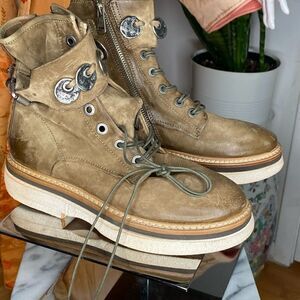 Step out in these must-have rugged leather boots featuring a utility-inspired crossover ankle strap with buckle detailing and hammered metal charms in a cool, stacked sole silhouette.
