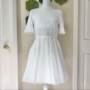 This dress features a ribbed mockneck tee under a corset-style bodice that flares out to a gathered mini skirt.