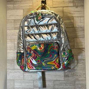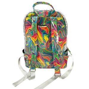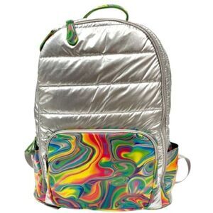 New Anthropologie x Bari Lynn Neon Rainbow Swirl Silver Puffer Backpack