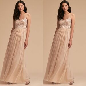 Embroidered leaves, beaded vines, and sequined blooms envelop a fitted v-neck bodice; thin straps and a tulle skirt finish the look.
