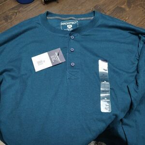 New with tag architect classic henley size men's XL. The color is teal agate black soft touch easy care fade resistant 25 inches across and 32 inches long.