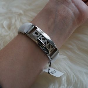 Stainless Steel Bangle Bracelet with Upper White Leather Dress Watch