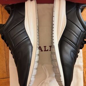 The Bally low-top sneakers are crafted of leather with a logo plaque and logo-embossed tongue. These sneakers feature paneled design, front lace-up fastening, round toe, flat rubber sole, and branded insole.
