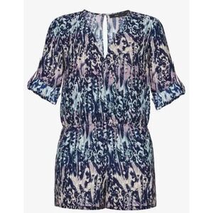 New. BGBGmaxzaria blue romper. Beautiful silky soft fabric that feels like silk but with the ease of polyester. Colors of blue, purple, green and cream. Sleeve roll up and secure with tabs. Plenty of room in this to move around.