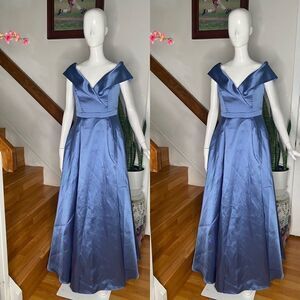 A lustrous satin fabric and off-the-shoulder neckline lend a distinctly mid-century air to this gorgeous dress