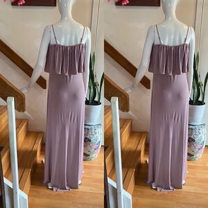 this chic maxi dress features a wide ruffle that can be styled five different ways: at the shoulder, off the shoulder, one shoulder, with straps, or without straps. Pull-on styling with detachable sash at waist