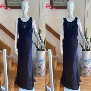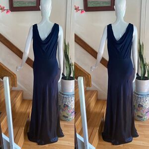 Old Hollywood glamour defines this ultra-elegant gown, featuring a pleated georgette bodice with a romantic, draped cowl in the back. A long, satiny skirt skims the body, then sweeps to the floor for an unforgettable silhouette.