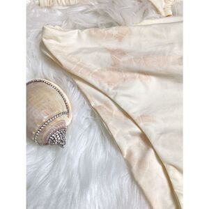 Beautiful double thickness of fabric cream and peach tie-dye bikini. Super sexy with three rings down the front and crisscross strapping in the back. Partway ruched down the bottoms. Cheeky cut. I love it!