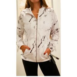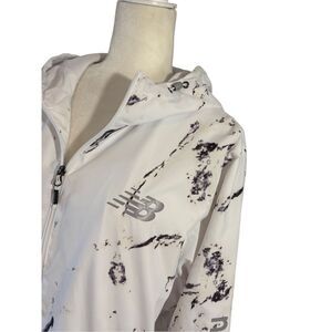Like new! New Balance white marble print water resistant jacket. Pull string hood and bottom. Lined. Zip pockets.
