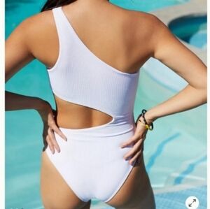 Elegant white one-piece swimsuit perfect for beach days. Enjoy a stylish and comfortable fit.