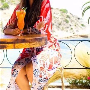 Stunning Beach cover up in a floral design with exotic birds. Color is vibrant and fabric is 100% cotton. Also has a matching belt tie