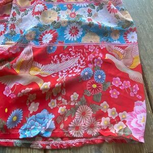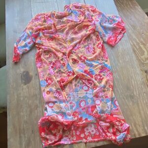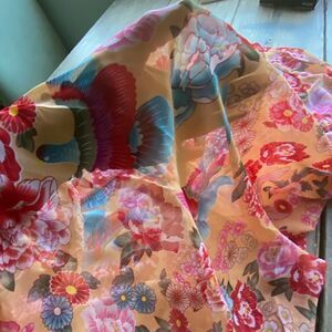 Stunning Beach cover up in a floral design with exotic birds. Color is vibrant and it is sheer. Also has a matching belt tie