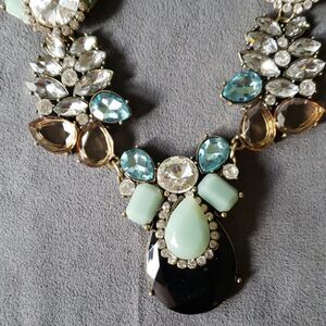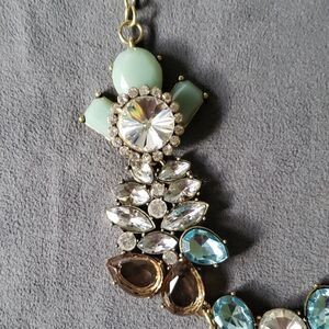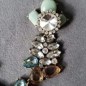 It has Teal, blue, topaz, clear and jade stones set in an antique yellow gold