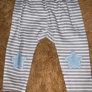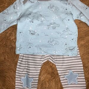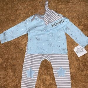 Cap, t-shirt and pants outfit. Gray and white striped cap with “Roar” in gray on front and baby blue on brim. Long sleeve baby blue shirt with gray outlined dinosaurs, roar and stars. Gray and white striped pants with baby blue stars. Size 3-6 months.