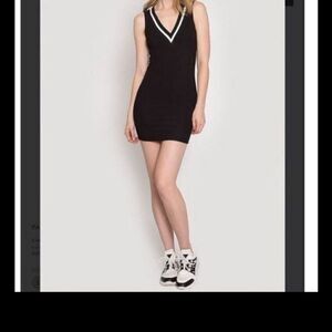 This brand new black dress by Wet Seal is perfect for a ton of occasions! Done in 97% polyester and 3% spandex, it has a lot of stretch to fit your curves perfectly. It has a white striped V-neck and a back zipper closure. It is size Large and measures 34” in length from the top of the shoulder to the bottom hem. It measures 16” across from armpit to armpit and does have extra stretch!