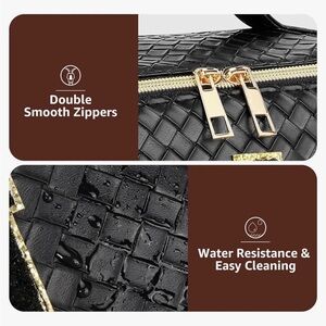 Stylish black woven toiletry bag with a gold X design. Features a spacious interior with multiple compartments.