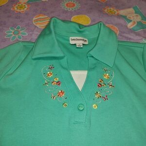 New with tags breckenridge garden flutter short sleeve top size women's small. The color is aqua spirit is collared has butterflies and flowers at the top