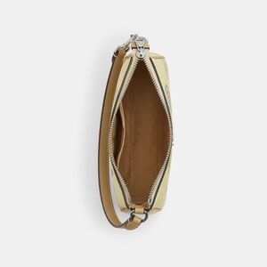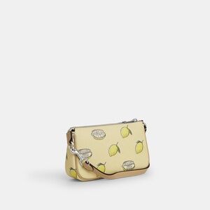Printed coated canvas Two credit card slots Zip-top closure fabric lining Handle with 6 1/4 drop