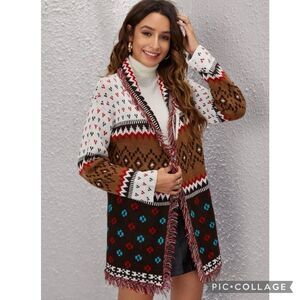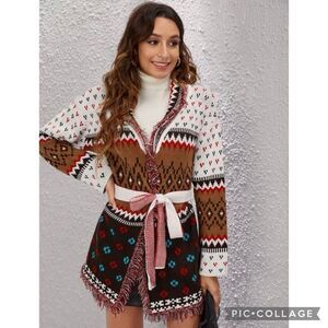 New Cowichan Fringe Knit Cardigan Tribal Western Sweater with Belt Size Medium